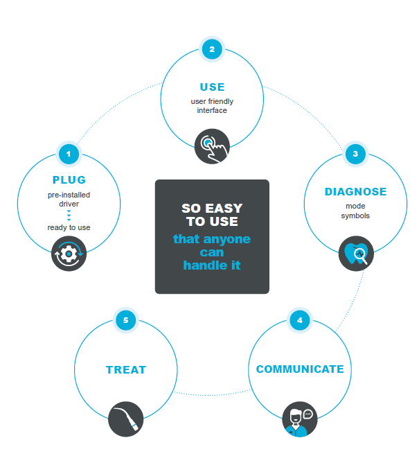 Accomplish a more efficient and performant clinical evaluation thanks to our ergonomic 4 in 1 diagnostic aid camera. In one click, switch from Daylight vision mode to Daylight+, Perio or Cario vision mode.
